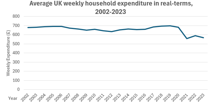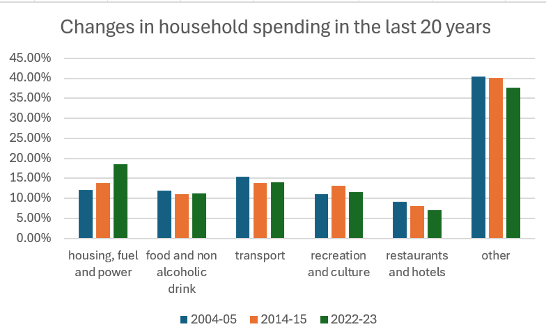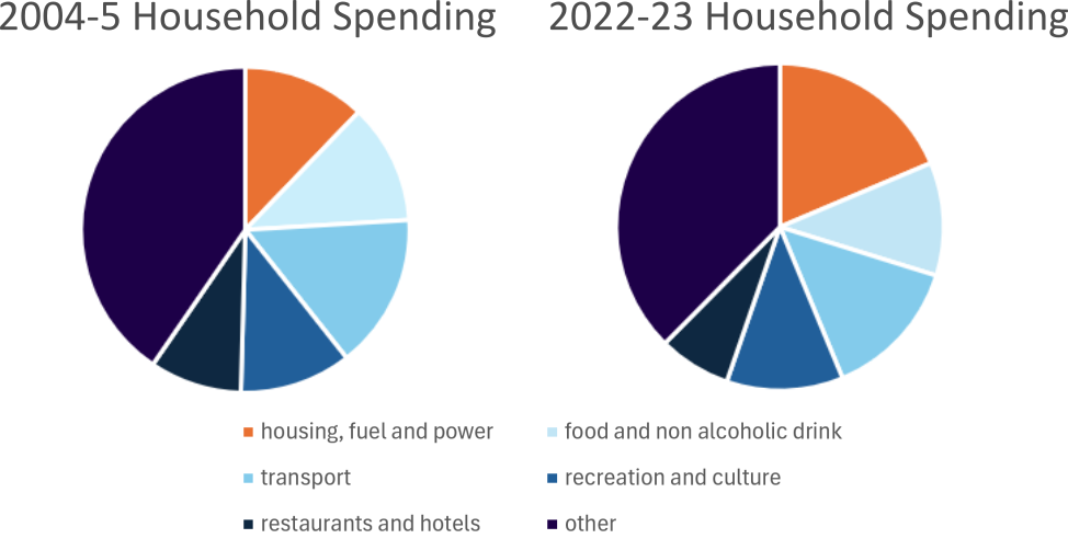In the pie chart above of household expenses, we can see the orange sector which corresponds to housing, fuel and power costs is much bigger now than it was 20 years ago. While average weekly spending remains similar to two decades ago in real terms, a larger share is now consumed by essential costs such as housing, energy, and food. This means households have less flexibility and are more vulnerable to economic shocks—especially those on lower incomes, who spend a higher proportion of their budget on necessities.