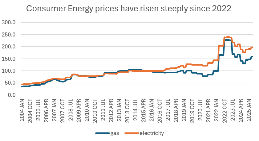 The UK’s reliance on gas imports left households vulnerable when Russia invaded Ukraine in 2022. Global energy prices surged, and although government interventions (like the Energy Price Guarantee) mitigated the worst spikes, bills remain high in real terms.
