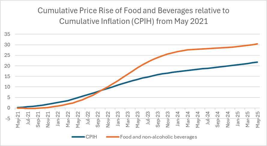 While overall inflation (CPIH) rose around 20% from May 2021 to early 2024, food prices rose over 30%, with some staples like bread, pasta, and dairy products increasing by over 40% 4.